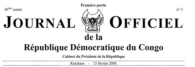 SOMMAIRE PRESIDENCE DE LA REPUBLIQUE 09 février 2008 - Ordonnance d'organisation judiciaire n° 08/010 portant mise à la retraite des magistrats du siège, col. 5. 09 février 2008 - Ordonnance d'organisation judiciaire n° 08/011 portant mise à la retraite des magistrats du Ministère public, col. 7. 09 février 2008 - Ordonnance d'organisation judiciaire n° 08/012 constatant la démission d'office de certains magistrats, col. 8. Ordonnance d'organisation judiciaire n° 08/013 du 09 février 2008 portant nomination des magistrats du siège, col. 10. 09 février 2008 - Ordonnance d'organisation judiciaire n° 08/014 portant nomination des magistrats du Ministère public, col. Il. 09 février 2008 - Ordonnance d'organisation judiciaire n° 08/015 portant nomination d'un Président de la Cour Suprême de Justice à titre posthume, col. 12. 09 février 2008 - Ordonnance d'organisation judiciaire n° 08/016 portant nomination d'un premier Avocat Général de la République à titre posthume, col. 13. 11 février 2008 - Ordonnance n° 08/017 portant création, organisation et fonctionnement du Comité de Pilotage de la mise en œuvre du plan de la République Démocratique du Congo relatif à l'éradication de la présence des groupes armés étrangers sur le territoire congolais, col. 14. GOUVERNEMENT Cabinet du Premier Ministre 21 janvier 2008 - Décret n° 08/02 modifiant le Décret n° 051116 du 24 octobre 2005 fixant les modalités de conversion des anciens titres forestiers et portant extension du moratoire en matière d'octroi des titres d'exploitation forestière, col. 17. 26 janvier 2008 - Décret n° 08/03 portant composition, organisation et fonctionnement du Conseil Consultatif National des Forêts, col. 18. Ministère de la Justice 02 novembre 2007 - Arrêté ministériel n° 029S/CAB/MIN/J&GSI 2007 accordant la personnalité juridique à l'association sans but lucratif non confessionnelle dénommée « Groupe d'encadrement pour le Développement Intégral » en sigle « GEDI », col. 21. 14 novembre 2007 - Arrêté ministériel n° 0329 CAB/MIN/J/2007 accordant la personnalité juridique à l'association sans but lucratif confessionnelle dénommée « Eglise Pentecôte nouvelle Vie» en sigle « E.P.N.V. », col. 22. 20 novembre 2007 - Arrêté ministériel n° 0336 CAIMIN/J/2007 approuvant la nomination des personnes chargées de l'administration ou de la direction de l'association sans but lucratif confessionnelle dénommée « 35ème Communauté Union des Eglises Baptistes au Congo» ECC/35ème C.U.E.B.C. », col. 24. 20 novembre 2007 - Arrêté ministériel n° 0339/CAB/MIN/J/2007 accordant la personnalité juridique à l'association sans but lucratif non confessionnelle dénommée « Solidarité Africaine pour le Développement Local et Régional» en sigle « S.D.L.E.R. », col. 25. 21 novembre 2007 - Arrêté ministériel n? 0346/CAB/MIN/J/2007 accordant la personnalité juridique à l'association sans but lucratif non confessionnelle dénommée « Fondation Odya Kalinda » en sigle « FK », col. 26. 23 novembre 2007 - Arrêté ministériel n° 0360ICAB/MIN/J&GSI 2007 accordant la personnalité juridique à l'association sans but lucratif confessionnelle dénommée « Action Réveil Spirituel» en sigle « A.R.S », col. 27. 23 novembre 2007 - Arrêté ministériel n° 0367/CAB/MIN/J12007 accordant la personnalité juridique à l'association sans but lucratif non confessionnelle dénommée « Groupe des Volontaires pour le Développement du Kasaï» en sigle « G.V.D.KA », col. 2S. 23 novembre 2007 - Arrêté ministériel n° 0372/CAB/MINIJ12007 accordant la personnalité juridique à l'association sans but lucratif non confessionnelle dénommée « Prison Fellowship International» « (Fraternité des Prisons ») en sigle « FP/RDC », col. 29. 23 novembre 2007 - Arrêté ministériel n° 0373/CAB/MIN/J&GSI 2007 accordant la personnalité juridique à l'association sans but lucratif confessionnelle dénommée « Communauté Evangélique Néhémie» en sigle « CO.E.N. », col. 31. 23 novembre 2007 - Arrêté ministériel n° 03S4/CAB/MIN/J&GSI 2007 accordant la personnalité juridique à l'association sans but lucratif non confessionnelle dénommée « Association Ujamaa » en sigle « UA », col. 32. 23 novembre 2007 - Arrêté ministériel n° 03S5/CABIMIN/J&GSI 2007 accordant la personnalité juridique à l'association sans but lucratif non confessionnelle dénommée « Organisation d'Encadrement des Masses» en sigle « OREMAS-ONGD », col. 33. 23 novembre 2007 - Arrêté ministériel n° 0392/CAB/MIN/J12007 accordant la personnalité juridique à l'association sans but lucratif confessionnelle dénommée « Eglise Pentecôtiste la Main de l'Eternel» en sigle « E.P.M.E. », col. 34. 23 novembre 2007 - Arrêté ministériel n° 039S/CAB/MIN/J12007 accordant la personnalité juridique à l'association sans but lucratif confessionnelle dénommée « Communauté Mission Evangélique les Actionnaires» en sigle « M.E.A. », col. 35. 23 novembre 2007 - Arrêté ministériel n° 040S/CAB/MINIJ & GS/2007 accordant la personnalité juridique à l'association sans but lucratif confessionnelle dénommée « Communauté des Eglises la Bible Ouverte» en sigle « EBO », col. 37. 23 novembre 2007 - Arrêté ministériel n° 0409/CAB/MIN/J & GS/2007 accordant la personnalité juridique à l'association sans but lucratif non confessionnelle dénommée « Projet de Lutte contre le Sida et le Développement à Mahagi » en sigle « PROLUSIMA» , col. 38. 23 novembre 2007 - Arrêté ministériel n° 0412/CAB/MINIJI2007 approuvant la nomination des personnes chargées de l'Administration ou de la Direction de l'association sans but lucratif dénommée «Eglise des Adorateurs de Dieu au Congo » en sigle « E.A.D.CO », col. 39. 23 novembre 2007 - Arrêté ministériel n° 0413/CAB/MIN/J&GSI 2007 accordant la personnalité juridique à l'association sans but lucratif non confes