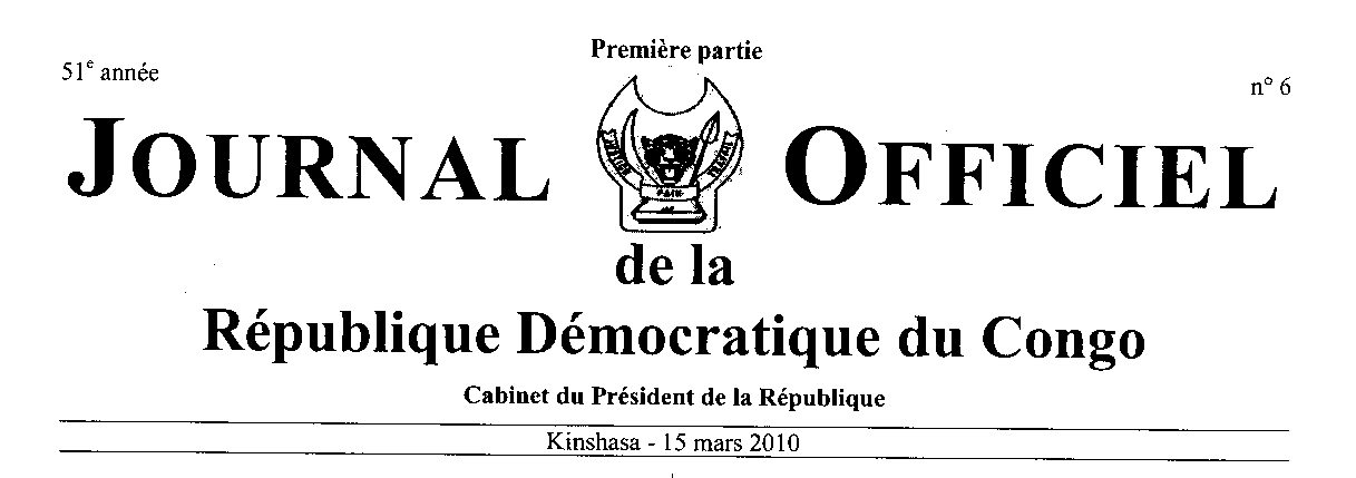 11 mars 2010-Arrêté n° 001/CAB/MIN.URB-HAB/CJ/AP/2010 modifiant l'Arrêté n° 013/CABMIN.URB-HAB/2005 du 06 mai 2005 réglementant la délivrance de l'autorisation de bâtir, col. 13. Ministère des Affaires Foncières 21 août 2009 - Arrêté ministériel n°106/Cab/Min/Aff.Fonc./2009 rapportant l'arrêté n°0119/CAB/ MIN/AFF.F./2006 du 08 décembre 2006 portant confirmation de l'arrêté ministériel CAB/MIN/AFF.F/1440/087/97 du 18 février 1997 portant déclaration d'un bien sans maître et reprise au domaine privé de l'Etat de la parcelle 313 du plan cadastral de la Commune de Limete, Ville de Kinshasa, col. 14. COURS ET TRIBUNAUX