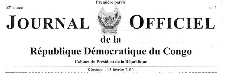 SOMMAIRE PRESIDENCE DE LA REPUBLIQUE 03 février 2011 - Ordonnance n° 11/012 portant investiture des membres de la Commission Electorale Nationale Indépendante (CENI), col. 4. GOUVERNEMENT Cabinet du Premier Ministre 21 janvier 2011 - Décret n° 011/04 portant mise en concession du Complexe sidérurgique de Maluku, col. 5. Cabinet du Vice-Premier Ministre, Ministre des Postes, Téléphones et Télécommunications, et Ministère des Finances, 02 février 2011 Arrêté interministériel n°001/CAB/VPM/MIN/PTT/2011 et n° 045/CAB/MIN/FINANCES/2011 modifiant et complétant l'Arrêté interministériel n° 005/CAB/MIN/PTT/2009 et n° 07l/CAB/MIN/FINANCES/ 2009 du 26 février 2009 portant fixation des taux de la taxe de numérotation à percevoir à l'initiative de l'Autorité de Régulation de la Poste et des Télécommunications du Congo pour l'utilisation des ressources en numération, col. 6. Ministère de la Justice et Droits Humains 25 juin 2010 - Arrêté ministériel n° 290/CAB/MIN/J&DH/ 2010 approuvant la nomination des personnes chargées de l'administration ou de la direction de l'association sans but lucratif confessionnelle dénommée «Diocèse de Goma », col. 8. 21 octobre 2010 - Arrêté ministériel n° 421/CAB/MIN/J& DH12010 accordant la personnalité juridique à l'association sans but lucratif non confessionnelle dénommée « Projet Mala pour le Développement », en sigle «PROMALADEV», col. 9. 21 octobre 2010 - Arrêté ministériel n° 423/CABIMIN/J& DH/2010 accordant la personnalité juridique à l'association sans but lucratif non confessionnelle dénommée « Assistance Sociale et Humanitaire aux Personnes Vulnérables », en sigle « ASALEM », col. 10. 09 novembre 2010 - Arrêté ministériel n° 456/CAB/ MIN/J&DH/2010 accordant la personnalité juridique à l'association sans but lucratif non confessionnelle dénommée «Fraternité Kivutienne », en sigle « F.K. Asbl », col. 11. 09 décembre 2010 - Arrêté ministériel n° 487/CABIMIN/ J&DH/20l0 .accordant la personnalité juridique à l'association sans but lucratif non confessionnelle dénommée «Centre Lazaret Multi-Services », en sigle « C.L.M.S.», col. 13. 31 décembre 2010 - Arrêté ministériel n° 544/CABIMIN/ J&DH/2010 .accordant la personnalité juridique à l'association sans but lucratif non confessionnelle dénommée «Groupe de Travail Climat Redd de la société civile », en sigle« G.T.C.R. », col. 14. 14 janvier 2011 -Arrêté .ministériel n°009/CAB/MIN/J& DH/2011 accordant la personnalité juridique à l'association sans' but lucratif non confessionnelle dénommée «Arche de l'Unité», en sigle «A.U .. », col. 15. 14 janvier 2011 - Arrêté ministériel n°0011/CAB/MIN/J& DH/2011 accordant la personnalité juridique à l'association sans but lucratif non confessionnelle dénommée «Hospice des Enfants Abandonnés», en sigle «RE.A Asbl», col. 17. Ministère de la Santé Publique 01 novembre 2010. Arrête ministériel n° l250/CAB/MIN/ SP/068/CJ/OMK/2010 portant création d'un comité de direction provisoire à l'Hôpital général provincial de référence Jason Sendwe, col. 18. Ministère de l'Enseignement Primaire, Secondaire et Professionnel 05 novembre 2009 - Arrêté ministériel n° MINEPSP /CABMIN/0450/2009 portant création et autorisation de fonctionnement. d'une école publique d'Enseignement Secondaire et Professionnel dans la Province du Sud-Kivu, col. 19. 21 septembre 2010 - Arrêté ministériel n°MINEPSP/ CABMIN/0426/2010 portant création et autorisation de fonctionnement des écoles publiques d'Enseignement Maternel, Primaire, Secondaire et Professionnel dans la Ville Province de Kinshasa, col. 20. COURS ET TRIBUNAUX ACTES DE PROCEDURE Ville de Kinshasa R.C 5986/III - Signification - L'Officier de l'état civil de la Commune de Kintambo, col. 22. R.C. 7060/II- Signification d'un jugement - L'Officier de l'état civil de la Commune, de Bandalungwa, col. 24. R.C. 3623 - Acte de notification d'un jugement supplétif - L'Officier de l'état civil de la Commune de Matete, col. 26. R.C. 23.098 - Signification d'un jugement avant dire droit et de date d'audience - Monsieur Mukendi Tshiamudiala et Crts, col. 28. R.C. 5459 - Signification de jugement - Monsieur Maheel Antoine, col. 29. RC 8270NI - Signification du jugement par extrait - Journal officiel de la RDC, col. 31. R.C. 96263 - Assignation en déguerpissement -Monsieur Guy Umba et Crts, col. 32. RC 104518 - Assignation en annulation de la vente et en déguerpissement à domicile inconnu - Madame Mwanza Ernbilo Crts, col. 33. R.C. 3.441 - A-venir simple - Monsieur Mpembele Albert et Crt, col. 35. Signification de l'arrêt avant dire droit RCA6138 et notification de date d'audience par affichage et publication au Journal officiel. - La société Ekanawe Sprl, col. 36. R.P. 21.272/1 - Citation' à domicile inconnu - Monsieur Ntono Bob, col. 36. R.P. 2153511 - Citation directe à domicile inconnu - Darne Bisiinwa Kajuru, col. 37. RP 20673-Notification d'appel et citation à comparaitre à domicile inconnu - Monsieur Bahati Morisho Fanfan, col. 39. R.P. 9661/ V - Citation directe - Madame Maleya Kabula et Crts, col. 40. R.P. 19050/1 - Citation directe à domicile inconnu - Monsieur Puis Mubiala et Crts, col. 41. R.P. 2 1. 627/VUI - Citation directe à domicile inconnu - Monsieur Sherali Mohamed Charles, col. 44. R.P .A. 517 - Notification de date d'audience à domicile inconnu par affichage et publication au Journal officiel - Monsieur Mabombi Kakumu, col. 46. RPNC II.902 -Signification d'Un jugement - Monsieur le Procureur de la République-près le TGI/Kinshasa Gombe et Crts, col. 46. Sommation judiciaire préalable à une action en justice sans préjudice d'une saisie à opérer dans les instants subséquents. Journal "Congo News", col. 48. Ville de Bukavu R.C. 8490 - Assignation en résolution du contrat - ECAG, col. 50. Ville de Mbandaka RC.2291 - Assignation à domicile inconnu - Monsieur Ifelo de Boeke