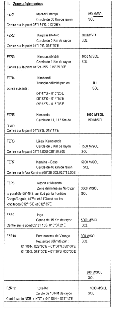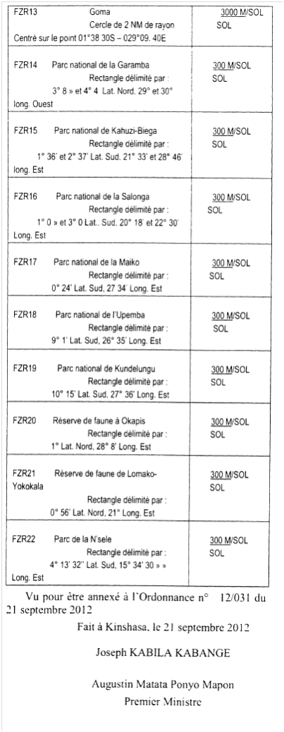 Ordonnance n°12/031 du 21 septembre 2012 fixant l'étendue et l'emplacement des zones interdites ou restreintes de survol en République Démocratique du Congo Le Président de la République. Vu la Constitution. telle que modifiée et complétée par la Loi n°11/002 du 20 janvier 2011 portant révision de certains articles de la Constitution de la République Démocratique du Congo du 18 février2006, spécialement en son article 79 : Vu la Convention relative à l'Aviation civile Internationale signée à Chicago le 07 décembre 1944 spécialement en son article 9 : Vu la Loi n° 10/014 du 31 décembre 2010 relative à l'aviation civile, spécialement en son article 93 : Vu l'Ordonnance n° 12/003 du 18 avril 2012 portant nomination d'un Premier Ministre, Chef du Gouvernement ; Vu l'Ordonnance n° 12/004 du 28 avril 2012 portant nomination des Vice-Premier Ministres, des Ministres, d'un Ministre délégué et des Vice-ministres du Gouvernement ; Vu l'Ordonnance n° 12/007 du 11 juin 2012 portant organisation et fonctionnement du Gouvernement, modalités pratiques de collaboration entre Je Président de la République et le Gouvernement ainsi qu'entre les membres du Gouvernement ; Vu l'Ordonnance n° 12/008 du 11 juin 2012 fixant les attributions des ministères; Considérant la nécessité ; Le Conseil des Ministres entendu: ORDONNE: Chapitre 1 : Des dispositions générales ct des définitions Article l : La présente ordonnance fixe conformément à l'article 93 de la Loi n° 10/014 du 31 décembre 2010 relative à l'aviation civile, l'étendue et 1'emplacement des zones interdites ou restreintes de survol par des aéronefs. Article 2 : Au sens de la présente Ordonnance, on entend par : 1. Zone dangereuse : espace aérien, de dimensions définies. à l'intérieur duquel des activités dangereuses pour le vol des aéronefs peuvent se dérouler pendant des périodes spécifiées ; 2. Zone interdite : espace aérien, de dimensions définies, au-dessus du territoire ou des eaux territoriales d'un Etat dans les limites duquel le vol des aéronefs est interdit ; 3. Zone réglementée : espace aérien, de dimensions définies, au-dessus du territoire ou des eaux territoriales d'Lm Etat, dans les limites duquel le vol des aéronefs est subordonné à certaines conditions spécifiées. Article 3: Les zones interdites ou restreintes de survol sont définies pour des raisons de nécessité militaire ou de sécurité publique. Chapitre II : Des dispositions relatives à l'autorisation de survol des zones interdites ou restreintes de survol Article 4: L'interdiction ou la restriction de survol s’applique à tout aéronef qui n'est pas couvert par une autorisation de survol ou qui n ·est pas dispensé de détenir une telle autorisation. Article 5 : L'autorisation de survol est délivrée par l'Autorité de 1 'Aviation Civile après avis favorable de l’Administrateur général de la sûreté, du Ministre ayant la Sécurité dans ses attributions ct de l'autorité militaire compétente. Article 6: L'Autorité de l'Aviation Civile détermine le modèle de l'autorisation de survol. Toute autorisation de survol mentionne : 1. le type d'aéronef couvert pour le survol. ainsi que ses marques de nationalité et d'immatriculation : 2. la ou les zones dont le survol est autorisé ; 3. le délai de validité de l'autorisation: 4. le nombre de survols autorisés ; 5. les conditions et restrictions qui seraient imposées lors du ou des survols des zones interdites ou restreintes. Article 7: Tous les aéronefs d'Etat congolais sont dispensés de 1 'autorisation de survol. Article 8 : Tout aéronef qui survole une zone interdite est tenu dès qu'il en est requis d'atterrir sur l'aérodrome le plus approché en dehors de la zone interdite. Il est saisi dès l'atterrissage. Article 9 : Sont spécialement commissionnés pour effectuer les perquisitions ou saisies de biens, papiers et documents détenus par toute personne se trouvant à bord d’un aéronef qui viendrait à survoler une zone interdite en violation des dispositions de la présente ordonnance : 1 . Les cadres de commandement des aéroports ; 2. Les agents de sûreté des aéroports. Sauf lorsqu'il y a état de guerre ou si la mobilisation générale est ordonnée, ces agents agissent sur instruction respectivement du Gouverneur de Province sous les ordres ct la surveillance duquel ils sont placés et du Président du Comité national de sûreté de l'aviation civile. Chapitre III : Des dispositions finales Article 10: Lorsque l'état de siège ou l'état d'urgence est proclamé conformément aux articles 85 et 145 de la Constitution, les vols par des aéronefs peuvent être temporairement interdits ou restreints au-dessus de tout ou partie du territoire national, avec effet immédiat. Article 11 : La liste des zones interdites et des zones restreintes de survol est celle reprise en annexe de la présente Ordonnance. Article 12 : La présente ordonnance qui entre en vigueur à la date de sa signature. Fait à Kinshasa, le 21 septembre 2012 Joseph KABILA KABANGE Augustin Matata Ponyo Mapon Premier Ministre
