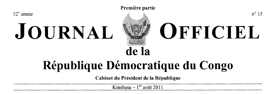 13 juin 2011 - Arrêté ministériel n° 219/CAB/MIN/ J&DH/2011 portant création, organisation et fonctionnement d'une Cellule de protection des défenseurs des Droits de l'Homme, col. 37. 16 juin 2011 - Arrêté ministériel n° 228/CAB/MIN/ J&DH/2011 accordant la personnalité juridique à l'association sans but lucratif non confessionnelle dénommée « Imagerie Médicale pour Tous» en sigle « IMT », col. 38. 16 juin 2011 - Arrêté ministériel n° 230/CAB/MIN/ J&DH/2011 approuvant les modifications apportées aux statuts et la désignation des personnes chargées de l'administration ou de la direction de l'association sans but lucratif confessionnelle dénommée « ECC/18ème Communauté Evangé1ique de l'Alliance au Congo », en sigle « C.E.A.C. », col. 40. 16 juin 2011 - Arrêté ministériel n° 237/CAB/MIN/ J&DH/2011 accordant la personnalité juridique à l'association sans but lucratif confessionnelle dénommée « Communauté Evangélique de Pentecôte» en sigle «CEP-Asbl », col. 41. 16 juin 2011 - Arrêté ministériel n° 240/CAB/M1N/ J&DH/2011 accordant la personnalité juridique à l'association sans but lucratif non confessionnelle dénommée « Fondazione Madre Agnese Manzoni Onlus (Fondation Mère Agnès Manzoni) », col. 43. 16 juin 2011 - Arrêté ministériel n° 245/CAB/MIN/ J&DH/2011 accordant la personnalité juridique à l'association sans but lucratif non confessionnelle dénommée « Astrale Luis pour la République Démocratique du Congo », en sigle « ALUP/RDC », col. 44. 16 juin 2011 - Arrêté ministériel n° 247/CAB/MIN/ J&DH/2011 accordant la personnalité juridique à l'association sans but lucratif non confessionnelle dénommée « Alliance Chrétienne pour le Développement Intégré », en sigle « ACDI/Ongd », col. 46. 16 juin 2011 - Arrêté ministériel n° 258/CAB/MIN/ J&DH/2011 accordant la personnalité juridique à l'association sans but lucratif non confessionnelle dénommée « Fondation le Rocher », col. 47. 21 juin 2011 - Arrêté ministériel n° 266/CAB/MIN/ J&DH/2011 accordant la personnalité juridique à l'association sans but lucratif confessionnelle dénommée « Eglise Evangélique de Pentecôte Carmel », en sigle « E.E.P.C », col. 49. 21 juin 2011 - Arrêté ministériel n° 267/CAB/MIN/ J&DH/2011 accordant la personnalité juridique à l'association sans but lucratif confessionnelle dénommée « Eglise des Prophètes de Jésus-Christ », en sigle « E.P.J. », col. 50. 24 juin 2011 - Arrêté ministériel n° 273/CAB/MIN/ J&DH/2011 accordant la personnalité juridique à l'association sans but lucratif confessionnelle dénommée «Ujumbe Wakati wa Mwisho », col. 51. 28 juin 2011 - Arrêté ministériel n° 279/CAB/MIN/ J&DH/2011 accordant la personnalité juridique à l'association sans but lucratif non confessionnelle dénommée « Fondation Nasser », en sigle « FONA », col. 53. 28 juin 2011 - Arrêté ministériel n° 280/CAB/MIN/ J&DH/2011 accordant la personnalité juridique à l'association sans but lucratif non confessionnelle dénommée « Fondation Alliance », en sigle « F ANDAL », col. 54. 28 juin 2011 - Arrêté ministériel n" 282/CAB/MIN/ J&DH/2011 accordant la personnalité juridique à l'association sans but lucratif non confessionnelle dénommée « Poba, Kisiwu et Mabiala », en sigle « PKIMA », col. 55. 11 juillet 2011 - Arrêté ministériel n° 288/CAB/MIN/ J&DH/2011 accordant la personnalité juridique à l'association sans but lucratif confessionnelle dénommée « Des Pères de la petite Mission pour les Sourds-muets », en sigle « Asbl P.M.S. », col. 57. 21 juillet 2011 - Arrêté ministériel n° 308/CAB/MIN/ J&DH/2011 accordant la personnalité juridique à l'association sans but lucratif non confessionnelle dénommée « Initiative pour le Développement Durable de la Salonga », en sigle» « I.D.D.S. », col. 58. Ministère de la Communication et des Médias 14 juin 2011 - Arrêté ministériel n° 035/2011 modifiant et complétant l'Arrêté 04/MIP/ 020/96 portant mesures d'application de la Loi 96-002 du 22 juin 1996 fixant les modalités de l'exercice de la liberté de la presse, col. 59. - Texte Cahier des charges des Medias audiovisuels exploitant en République Démocratique du Congo, col. 60. Ministère des Hydrocarbures 12 juin 2011 - Arrêté ministériel n° 003/CARMIN· HYDRO/CMK/2011 portant modification de l'Arrêté n° 013/CAB.MIN/ENER/2005 du 11 août 2005 portant fixation des coordonnées géographiques définissant les contours des blocs ouverts l'exploration dans la zone du Graben Albertine, col. 64. Ministère du Genre, de la Famille et de l'Enfant 29 décembre 2010 - Arrêté ministériel n° MIN.GEFAE/CAB.MIN/MALM/RN/014/2010 portant nomination des membres du Cabinet de la Ministre du Genre, de la Famille et de l'Enfant, col. 66. Ministère des Affaires Foncières 21 mars 20 11 - Arrêté ministériel n° 1 22/CAB/MIN/ AFF.FONC/2011 portant création d'une parcelle de terre à usage de décharge des produits chimiques n° 4822 du plan cadastral de la Commune de Maluku à Kinshasa, col. 68. 28 juin 2011 - Arrêté ministériel n° 197/CAB/MIN/AFF.FONC/2011 portant création d'une parcelle de terre n° 3363 à usage agricole du plan cadastral de la Commune de Maluku, Ville de Kinshasa, col. 69. 28 juin 2011 - Arrêté ministériel n" 198/CAB/MIN/AFF.FONC/2011 portant création d'une parcelle de terre n° 3361 à usage agricole du plan cadastral de la Commune de Maluku, Ville de Kinshasa, col. 70. 29 juin 2011 - Arrêté ministériel n° 195/CAB/MIN/AFF.FONC/2011 portant création d'une parcelle de terre n° 2555 S.R à usage agro-pastoral du plan cadastral de la Localité Kimnuana, Territoire de Songololo, dans la Province du Bas-Congo, col. 71. 29 juin 2011 - Arrêté ministériel n° 196/CAB/MIN/AFF.FONC/2011 portant création d'une parcelle de terre n° 5093 à usage agricole du plan cadastral de la Commune de Maluku, Ville de Kinshasa, col. 72. 11 ju